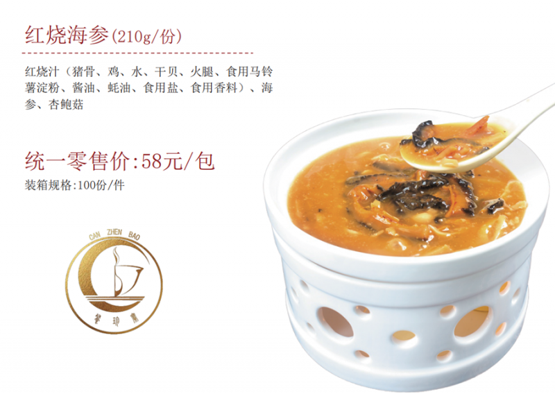 紅燒海參(210g/份) 紅燒汁(豬骨、雞、水、干貝、火腿、食用馬鈴 薯淀粉、醬油、蠔油、食用鹽、食用香料)、海 參、杏鮑菇 統(tǒng)一零售價(jià):58元/包 裝箱規(guī)格:100份/件 共0條 相關(guān)評(píng)論 |
