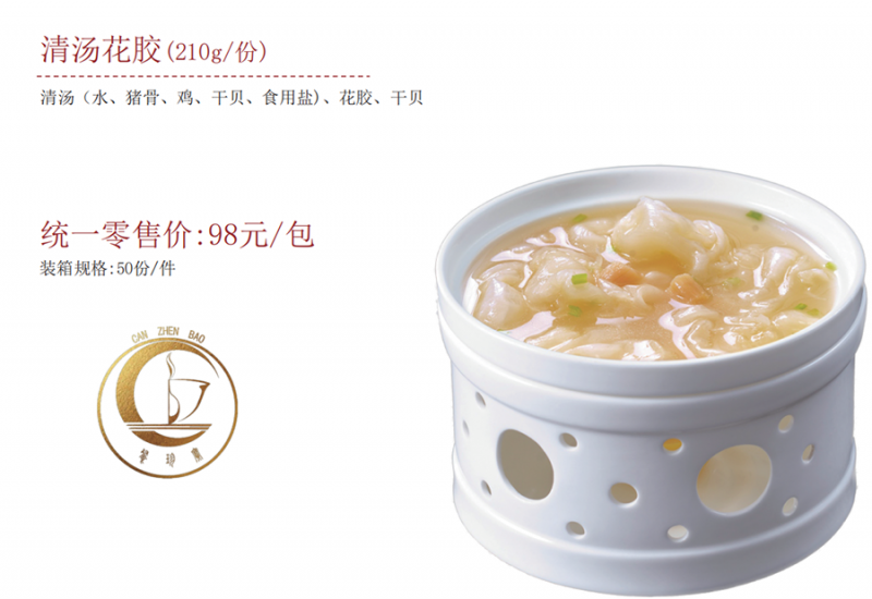清湯花膠(210g/份) 清湯(水、豬骨、雞、干貝、食用鹽)、花膠、干貝 統(tǒng)一零售價:98元/包 裝箱規(guī)格:50份/件