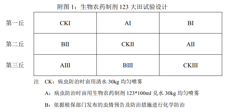 選面積在 3 畝左右肥力均勻且鄰近的水田 3 丘, 并將丘田均分為三份, 共設計生物農(nóng)藥制劑 123、 化學農(nóng)藥、 空白三個處理三次重復對比試驗。 (詳見附圖