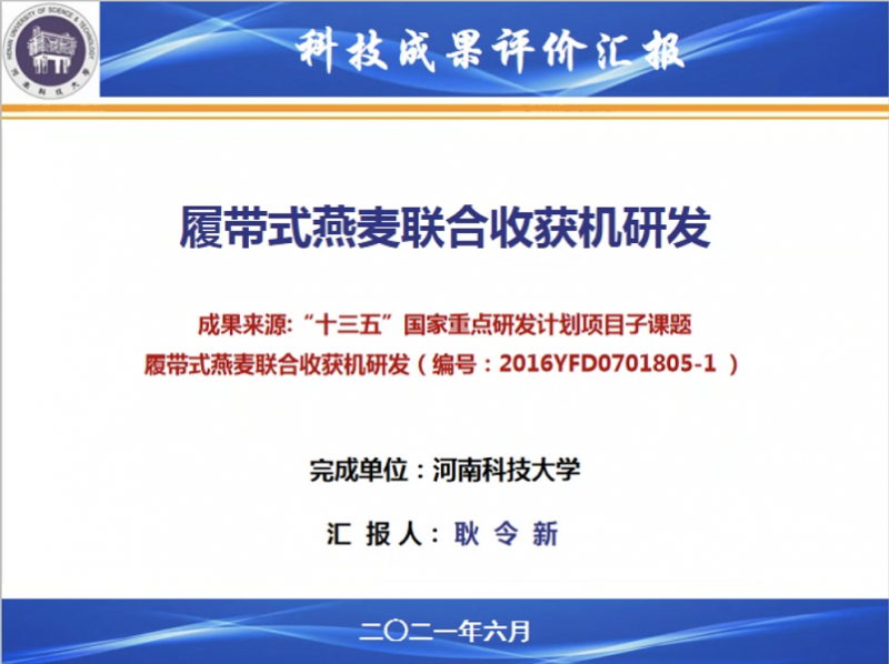 經(jīng)專家組全面審核,與會專家一致同意,由河南科技大學(xué)完成的“履帶式燕麥聯(lián)合收獲機(jī)研發(fā)”通過科技成果評價。