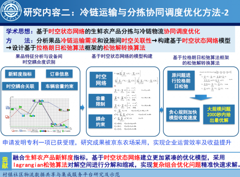 專家組經(jīng)評(píng)議認(rèn)為,成果針對(duì)生鮮農(nóng)產(chǎn)品“最先一公里”冷鏈倉(cāng)儲(chǔ)分揀設(shè)施協(xié)同運(yùn)營(yíng)管理難題,提出了冷鏈物流集儲(chǔ)運(yùn)一體化的平臺(tái)化運(yùn)營(yíng)模式,構(gòu)建了基于時(shí)空狀態(tài)網(wǎng)絡(luò)模型與Lagrangian松弛算法框架的復(fù)雜協(xié)同調(diào)度系統(tǒng)的分解轉(zhuǎn)化方法,設(shè)計(jì)了基于狀態(tài)空間的批服務(wù)排隊(duì)網(wǎng)絡(luò)規(guī)模分解方法,為化解冷鏈物流決策難題提供了新方法和新工具,研究成果富有創(chuàng)新性,具有重要的理論價(jià)值和實(shí)際應(yīng)用價(jià)值。成果面向我國(guó)村鎮(zhèn)冷鏈系統(tǒng)運(yùn)營(yíng)管理實(shí)際需求,實(shí)現(xiàn)了生鮮農(nóng)產(chǎn)品“最先一公里”集儲(chǔ)運(yùn)資源的高效整合,為解決冷鏈物流決策難題提供了定量分析新方法和新工具,有利于逐步建立和完善我國(guó)生鮮農(nóng)產(chǎn)品“最先一公里”的集儲(chǔ)運(yùn)一體化體系,對(duì)于提高村鎮(zhèn)冷鏈運(yùn)營(yíng)管理水平和降低農(nóng)產(chǎn)品冷鏈運(yùn)輸成本具有較高的推廣應(yīng)用價(jià)值。成果總體達(dá)到國(guó)內(nèi)先進(jìn)水平,其中“農(nóng)產(chǎn)品冷鏈物流集儲(chǔ)運(yùn)時(shí)空網(wǎng)絡(luò)協(xié)同優(yōu)化算法”達(dá)到國(guó)內(nèi)領(lǐng)先水平。