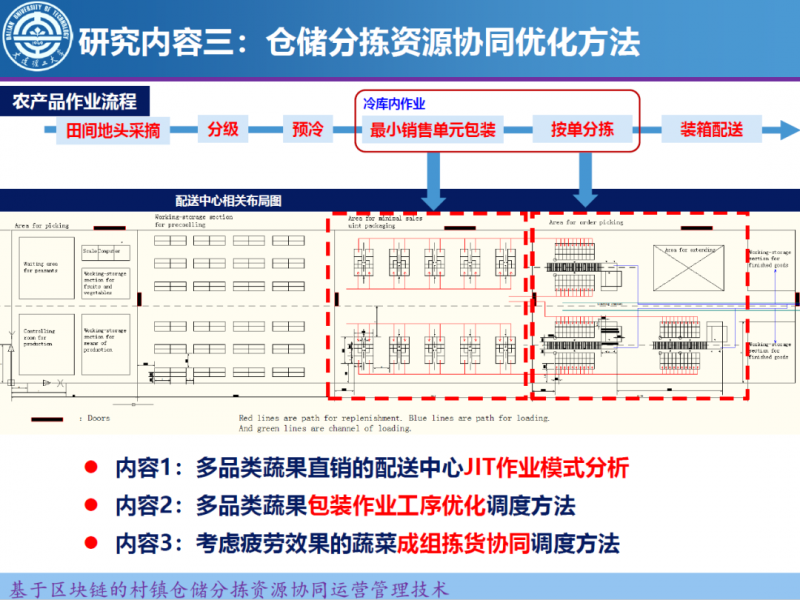 專家組經(jīng)評(píng)議認(rèn)為,成果針對(duì)村鎮(zhèn)倉儲(chǔ)分揀資源協(xié)同運(yùn)營管理難題,采用區(qū)塊鏈技術(shù)、優(yōu)化理論方法等,構(gòu)建了基于區(qū)塊鏈技術(shù)的安全可信、高效匹配和可信交易的分散冷庫倉儲(chǔ)資源共享平臺(tái)系統(tǒng),提出了綜合考慮多目標(biāo)、多類型服務(wù)資源、多環(huán)節(jié)協(xié)同銜接的冷鏈倉儲(chǔ)預(yù)處理設(shè)施協(xié)同運(yùn)作優(yōu)化新方法,設(shè)計(jì)了考慮疲勞效果和工人效率變化的多品類蔬果標(biāo)準(zhǔn)銷售單元包裝作業(yè)和個(gè)性化訂單分揀作業(yè)的優(yōu)化新方法,富有創(chuàng)新性,具有重要的理論價(jià)值與應(yīng)用價(jià)值。成果研發(fā)的“村鎮(zhèn)倉儲(chǔ)分揀資源協(xié)同運(yùn)營管理技術(shù)”,在陜西洛川縣、西藏林芝等地的水蜜桃、蘋果、松茸等村鎮(zhèn)產(chǎn)業(yè)以及北京昊宇神鷹公司分揀中心作業(yè)中進(jìn)行了應(yīng)用與示范,驗(yàn)證了方法與技術(shù)的可行性,取得了顯著的社會(huì)效益和經(jīng)濟(jì)效益。成果面向我國村鎮(zhèn)倉儲(chǔ)分揀資源協(xié)同運(yùn)營管理實(shí)際需求,實(shí)現(xiàn)了安全可信的倉儲(chǔ)資源共享,為破解村鎮(zhèn)倉儲(chǔ)分揀中多主體、多資源、多環(huán)節(jié)、多品類的優(yōu)化決策難題提供了新方法和新技術(shù),有利于推進(jìn)我國村鎮(zhèn)資源的多主體共享和現(xiàn)代化建設(shè)、提高村鎮(zhèn)倉儲(chǔ)分揀資源運(yùn)營管理水平,對(duì)降低農(nóng)產(chǎn)品采后損耗、提高分揀效率具有重要的理論和實(shí)際意義。成果總體達(dá)到國內(nèi)領(lǐng)先水平。