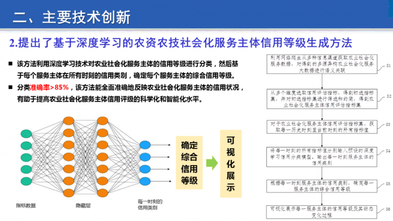 專家組經(jīng)評議認為,成果構(gòu)建了具有領(lǐng)域針對性的農(nóng)資農(nóng)技社會化服務主體信用評級指標體系,提出了基于深度學習和聯(lián)邦學習的農(nóng)資農(nóng)技社會化服務主體信用等級劃分方法,研發(fā)了農(nóng)資農(nóng)技社會化服務主體信用評級信息系統(tǒng),提高了農(nóng)資農(nóng)技社會化服務主體信用評級的自動化和智能化水平,技術(shù)集成水平和產(chǎn)品研發(fā)具有創(chuàng)新性。該成果具有評級結(jié)果客觀、操作簡便、更新頻率高、時效性強等特點,可在一定程度上彌補傳統(tǒng)信用評級工作中主觀性較強等不足,有助于提升我國農(nóng)資農(nóng)技社會化服務主體信用評級的智能化水平,能夠促進農(nóng)業(yè)社會化服務行業(yè)科技進步。該成果建立了農(nóng)資農(nóng)技社會化服務主體信用評價體系,可在一定程度上解決新型農(nóng)業(yè)經(jīng)營主體缺乏合格抵質(zhì)押物、金融機構(gòu)缺少信用信息、整個行業(yè)缺少評價體系等問題。該成果已在浙江農(nóng)資集團有限公司旗下的“呼呼打藥平臺”等產(chǎn)品中得到示范應用,取得了良好的經(jīng)濟效益和社會效益。成果達到國內(nèi)領(lǐng)先水平,技術(shù)熟化程度高,具有廣闊的應用前景。