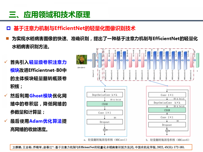 專家組經(jīng)評(píng)議認(rèn)為,成果為提高病蟲害圖像診斷的準(zhǔn)確率,研究了基于卷積神經(jīng)網(wǎng)絡(luò)集成的農(nóng)作物病蟲害智能診斷方法,提出了基于注意力機(jī)制與EfficientNet的輕量化圖像識(shí)別技術(shù)以及深度卷積神經(jīng)網(wǎng)絡(luò)動(dòng)態(tài)選擇集成技術(shù),為農(nóng)作物病蟲害的精準(zhǔn)防控提供了技術(shù)保障,具有明顯技術(shù)自主創(chuàng)新。該成果的應(yīng)用與推廣,提高了農(nóng)作物病蟲害識(shí)別的智能化程度,為農(nóng)作物病蟲害的精準(zhǔn)防控提供了技術(shù)保障,具有一定的市場(chǎng)競(jìng)爭(zhēng)力。該成果操作簡(jiǎn)便、可靠性高,能夠?qū)崿F(xiàn)農(nóng)作物病蟲害圖像的快速準(zhǔn)確識(shí)別。成果達(dá)到國(guó)內(nèi)外同類技術(shù)先進(jìn)水平,技術(shù)熟化程度高,具有較好的推廣應(yīng)用價(jià)值。