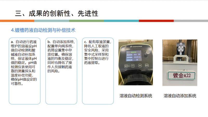 該成果突破了機(jī)械手靈活抓取和自動(dòng)尋跡技術(shù)、人與氰化物多重隔離安全防護(hù)技術(shù)、劇毒品鍍種集中管理技術(shù)、電鍍槽防揮發(fā)技術(shù)、矩陣式電鍍生產(chǎn)線以及鍍槽藥液自動(dòng)檢測(cè)與補(bǔ)償技術(shù)等關(guān)鍵技術(shù),實(shí)現(xiàn)了多品種小批量應(yīng)用,具有自動(dòng)化程度高、應(yīng)用轉(zhuǎn)化前景廣泛等優(yōu)點(diǎn),未來具有良好的技術(shù)成果轉(zhuǎn)化和推廣應(yīng)用前景。4.技術(shù)創(chuàng)新對(duì)推動(dòng)行業(yè)科技進(jìn)步和提高市場競爭能力的作用 |