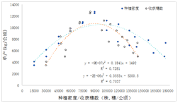 圖1 單產(chǎn)與種植密度間的關(guān)系 | 圖2 60 cm收獲機具的收獲損失與 種植行距的關(guān)系 |