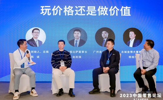 主題對話環(huán)節(jié),由成都奧特樂創(chuàng)始人、總裁陳誠主持;比格披薩董事長趙志強,廣州金卯角總經(jīng)理薛洪偉,永城金博大董事長楊旭東,深入探討了企業(yè)“玩價格還是做價值”的話題。