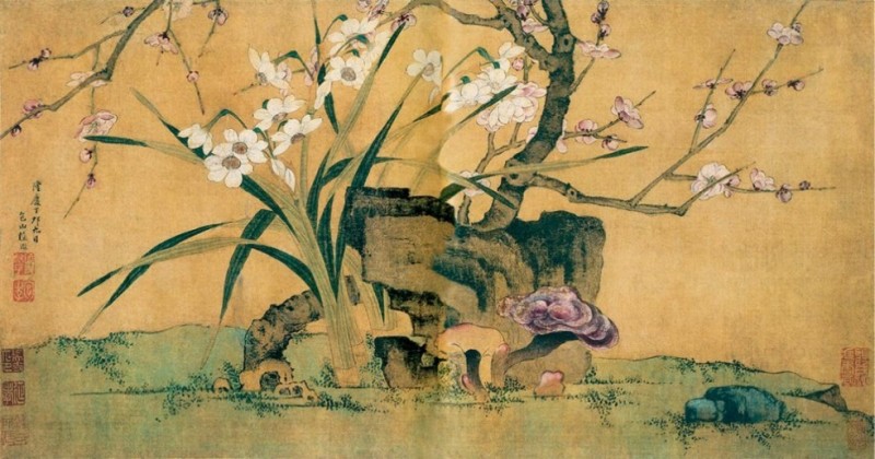 陸治 《梅石水仙圖》 絹本 縱32.3厘米 橫63.6厘米 南京博物院藏