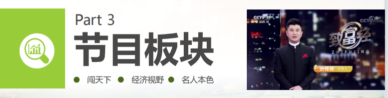 欄目宣傳語: 財富無處不在,行動成就夢想! 別人的致富項目不可以照搬, 但別人的致富經(jīng)驗一定要參考,《致 富經(jīng)》節(jié)目就是要激發(fā)觀眾的財富敏感,讓觀眾善于把握商機,發(fā)現(xiàn)自己身邊的財富。以獨特的視角詮釋財富與機遇的關(guān)系,可以觸動觀眾積極向上的致富想法,不要對生活失去熱忱與信心。
