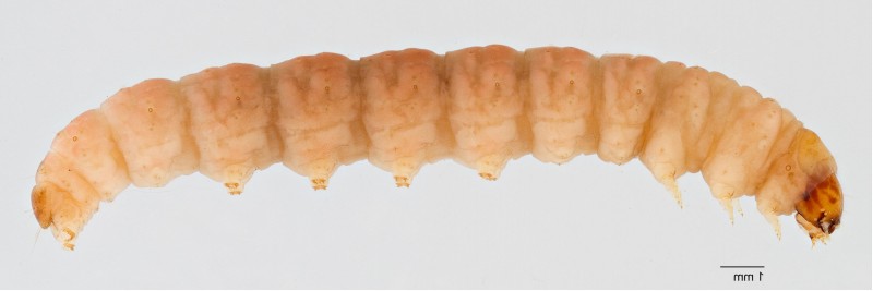 幼蟲體長10~13毫米,淡紅至桃紅色,頭褐色;前胸盾淺黃褐色,臀板淺褐色。胸、腹部淡紅色或粉色。臀櫛4~7齒,齒深褐色。腹足趾鉤單序環(huán)30~40個,臀足趾鉤20~30個。前胸氣門前片上有3根剛毛。