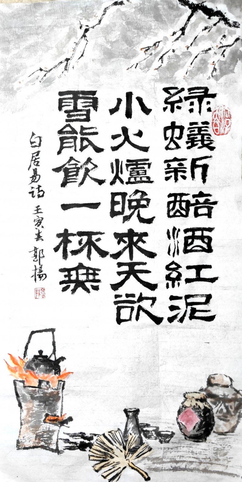 有感近日京城大雪,隨仿白居易《問劉十九》詩一首:“綠柳新芽抽,紅杏尚含羞。春來天又雪,暢飲杯停無?”,并書原《問劉十九》以分享共賞。