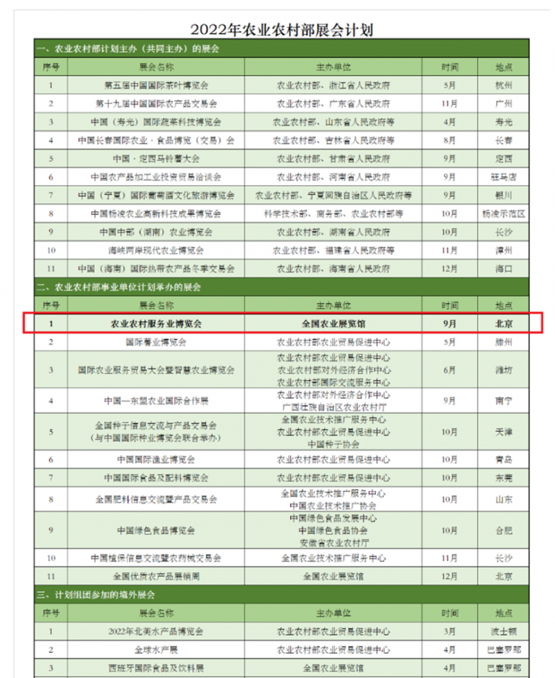 農(nóng)業(yè)農(nóng)村部《2022年農(nóng)業(yè)農(nóng)村部展會(huì)計(jì)劃》