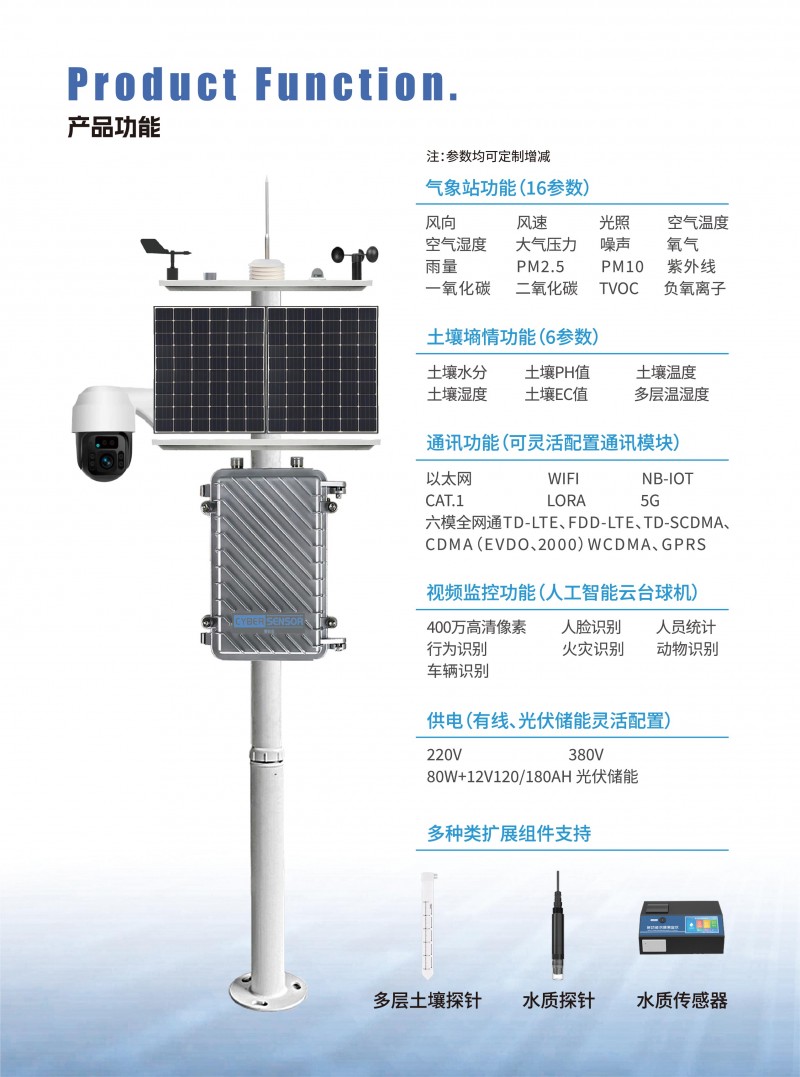 與普通監(jiān)測一體化站相比較,哨兵融合氣象站,土壤墑情監(jiān)測儀,視頻監(jiān)控等功能,功能更全,設(shè)備更便捷,配合相應(yīng)軟件,所有數(shù)據(jù)一目了然。哨兵創(chuàng)新性的使用氣象十六要素土壤七要素一體化傳感,在哨兵系統(tǒng)的技術(shù)方面,我們采用了獨(dú)創(chuàng)技術(shù),使其具有高精度、一體化、低功耗、耐腐蝕、工業(yè)級等特點(diǎn),采用有線和光伏供電,以太網(wǎng)、4g、lora無線通訊,免費(fèi)云平臺服務(wù)讓使用者能夠更加快速運(yùn)用,準(zhǔn)確獲得采集數(shù)據(jù)。