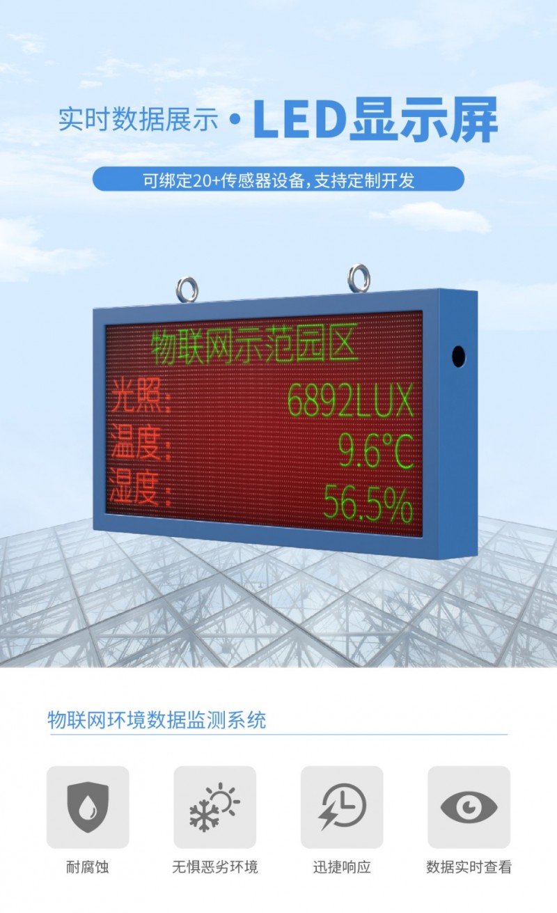 關鍵詞:溫室LED屏實時顯示100*50cm數(shù)據(jù)實時監(jiān)測,供應,現(xiàn)代農(nóng)業(yè)(智慧 數(shù)字 生態(tài))無人機,檢測/傳感器/攝像頭/數(shù)據(jù)采集