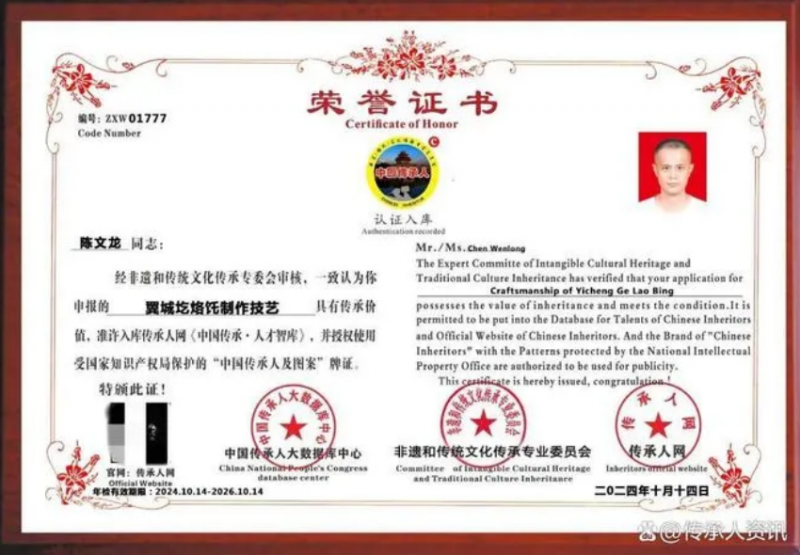 如今,翼城圪烙饦不僅是當(dāng)?shù)厝瞬妥郎系某?停仓饾u走出翼城,被更多的人所知曉和喜愛。一些當(dāng)?shù)氐牟宛^將圪烙饦作為招牌美食,吸引著來自四面八方的食客。這份獨特魅力也讓它收獲了官方認(rèn)可:2019年,翼城圪烙饦制作技藝被列入臨汾市非物質(zhì)文化遺產(chǎn)代表性名錄,評審專家以“黃而不焦、酥而不膩、軟而不綿”概括其風(fēng)味三絕,更因其跨越四千年的技藝傳承,冠以“遠古華夏第一餅”的美譽。2024年,傳承人陳文龍憑借對傳統(tǒng)技藝的堅守與創(chuàng)新,被“中國傳承人網(wǎng)”收錄入庫,獲頒“中國傳承人”認(rèn)證牌匾,讓這門手藝的價值得到更廣泛的認(rèn)可。