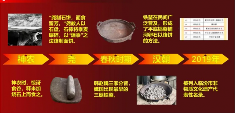 圪烙饦的烹飪技藝,源自遠古的石烹法。據(jù)《翼城縣志》記載,當(dāng)?shù)匦率鲿r代遺址曾出土大量石鏊殘片,印證了先民以石為器烙制食物的史實。從石器時代的石鏊烙食到鐵器時代的三腿鐵鏊革新,這項技藝跨越陶器、青銅器的文明更迭,在翼城土地上生根發(fā)芽。西漢時期,鐵鏊與石磨技術(shù)的普及,讓石子烙餅法從貴族宴席走入民間?!稘h武帝別國洞冥記》中記載,漢武帝泛舟汾河時品食的“石子餅”,形如圓月、酥脆留香,這便是圪烙饦的早期形態(tài)。相傳堯王受封唐侯時,其封地核心就在翼城。這位賢君見先民以石烹食,便琢磨著改進技法——將發(fā)酵面團裹入“野果碎”,用燒熱的河卵石焙烤,既保留谷物本香,又添了幾分甘甜。百姓感念其智慧,稱這種餅為“堯王餅”,這便是圪烙饦最早的文化印記。